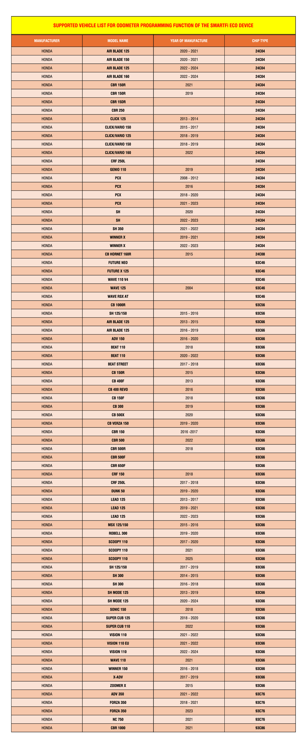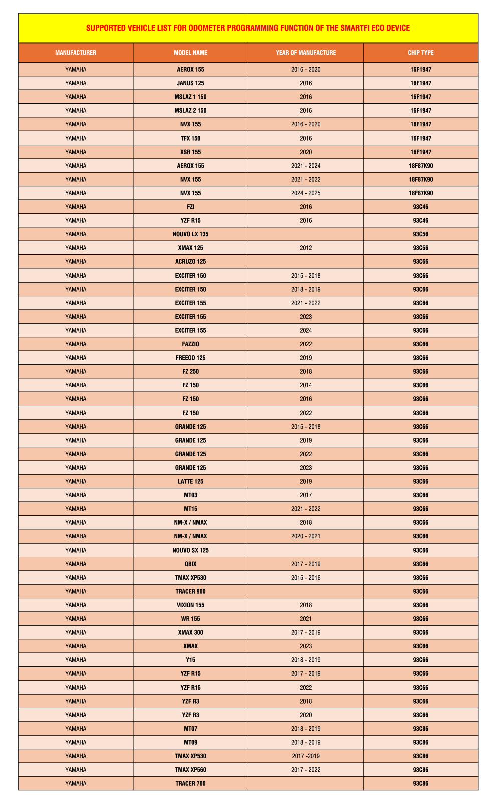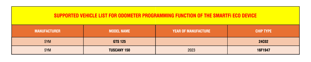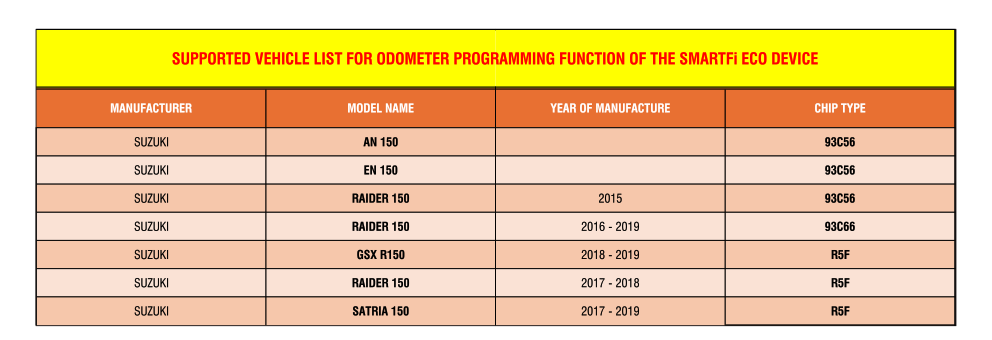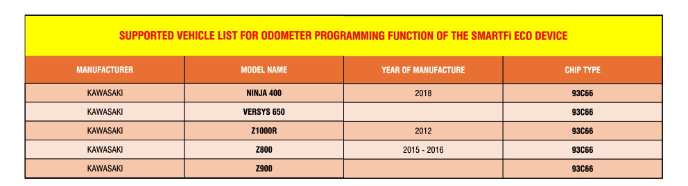 LIST OF MOTORCYCLES SUPPORTED FOR ODOMETER PROGRAMMING FUNCTION BY THE SMARTFI ECO DEVICE