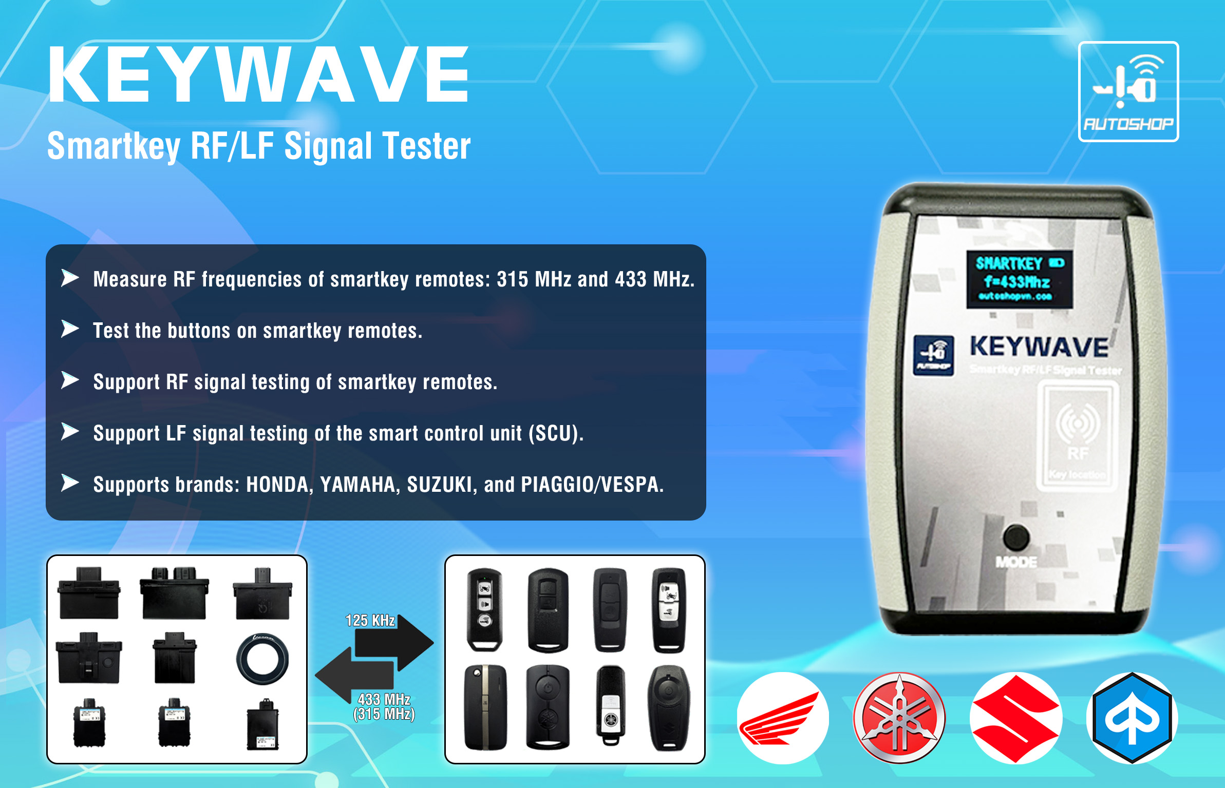 ➢ KEYWAVE is an indispensable diagnostic tool when working with Smartkey-equipped motorcycles. The device allows quick testing of RF/LF signal strength and frequency to assess the operating condition of the key and the SCU unit. With its ability to accurately detect interference and signal loss, KEYWAVE helps technicians pinpoint issues within seconds. Its modern, user-friendly design makes it ideal for use in repair shops.