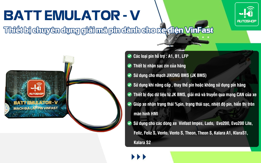 Autoshop chính thức ra mắt Batt Emulator - V, thiết bị chuyên dụng được phát triển nhằm hỗ trợ người dùng xe điện VinFast trong quá trình nâng cấp, thay thế pin hoặc khi không sử dụng pin chính hãng. Với thiết kế nhỏ gọn, độ ổn định cao và khả năng tương thích rộng rãi, đây là giải pháp tối ưu cho các kỹ thuật viên, garage và người dùng muốn linh hoạt hơn trong việc sử dụng pin cho xe điện.
