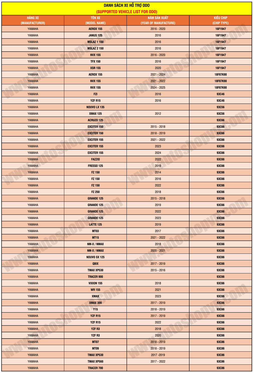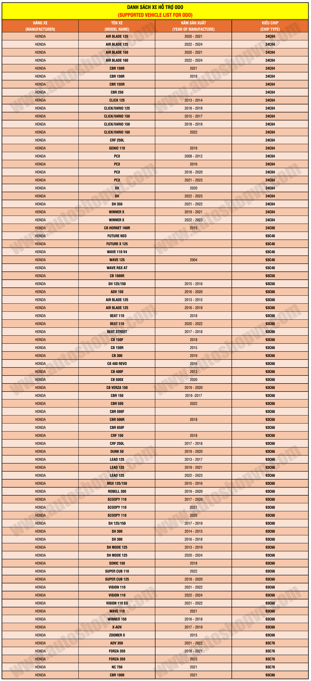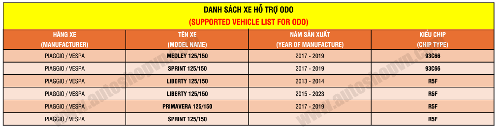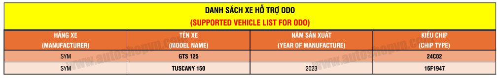 Danh sách xe hỗ trợ chức năng hiệu chỉnh giá trị ODO