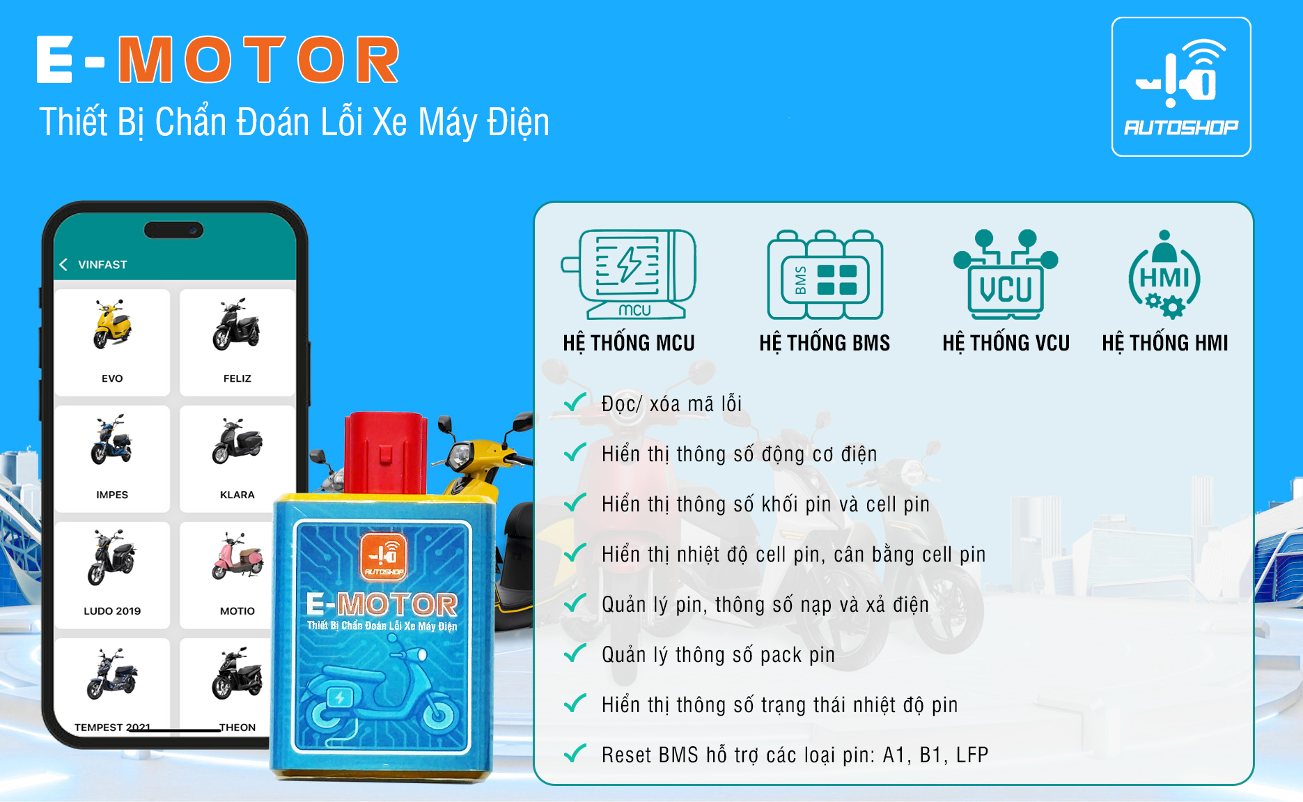 Autoshop chính thức giới thiệu E Motor – thiết bị chuyên dụng dành cho các dòng xe máy điện, với khả năng chẩn đoán toàn diện hệ thống điện và tùy chỉnh tốc độ vận hành. Đặc biệt, thiết bị được tích hợp kết nối Bluetooth thông qua ứng dụng E MOTOR, giúp người dùng dễ dàng thao tác, theo dõi tình trạng xe và tối ưu hiệu suất.